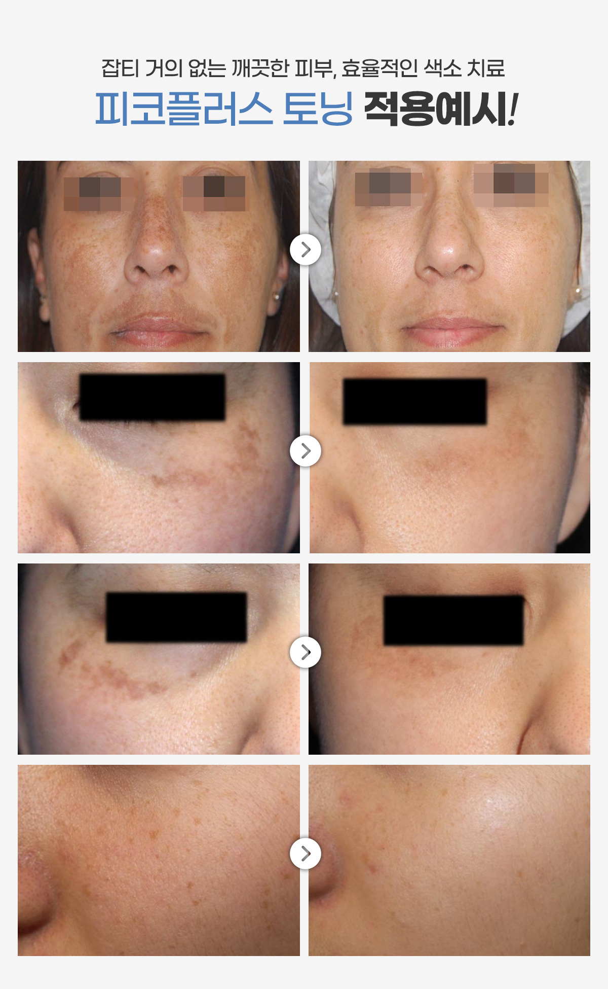 피코토닝은 나노세컨드보다 1000배 빠른 속도로 레이저를 조사하는 장비로,빠른 조사속도로 주변 조직의 손상 및 통증이 적다는 장점이 있습니다.또한 멜라닌에 반응률이 높은 파장대를 사용하므로 더 정밀한 색소치료가 가능한 시술입니다.